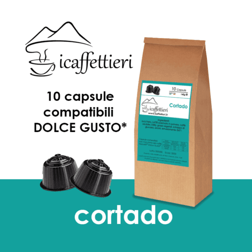 CONTENUTO DELLA CONFEZIONE: 10 capsule compatibili Dolce Gusto Cortado. Peso netto 140 grammi (14 grammi per capsula).