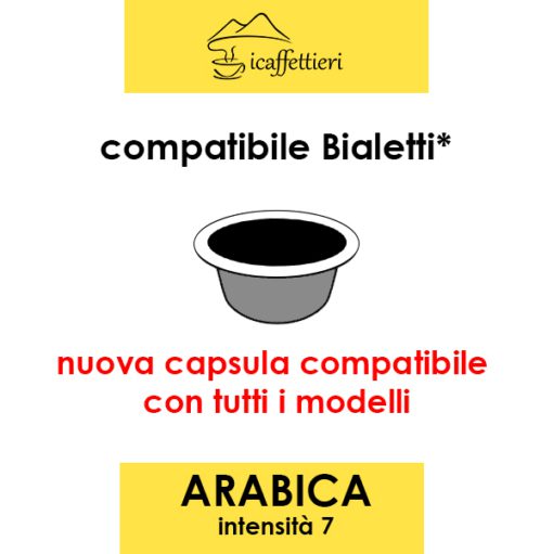 Prova le nuovissime compatibili Bialetti* MOKAESPRESSO* ARABICA de I Caffettieri. Un espresso cremoso e soave per tutte le macchine espresso Bialetti*. Confezione da 100 capsule. Nuova capsula da 7,2 grammi.