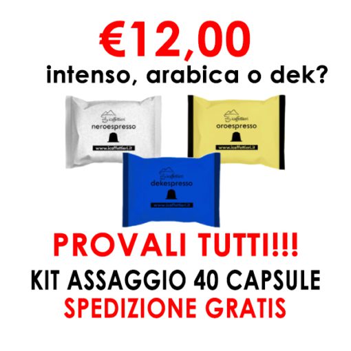 Componi il KIT assaggio da 48 capsule compatibili Nespresso ® a step da 16 pezzi. Scegli tra 3 miscele di caffè, orzo, te al limone, ginseng e mini cioccolato nelle quantità che desideri.